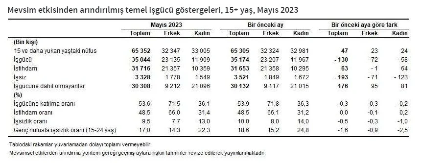 TÜİK, mayıs ayı Hanehalkı İşgücü Araştırması sonuçlarını duyurdu. Araştırma sonuçlarına göre, 15 ve daha yukarı yaştaki kişilerde işsiz sayısının 2023 yılı Mayıs ayında bir önceki aya göre 193 bin kişi azalarak 3 milyon 328 bin kişi olduğu belirtildi. İşsizlik oranı ise 0,5 puan azalarak yüzde 9,5 seviyesinde gerçekleşti. İşsizlik oranı erkeklerde yüzde 7,7 iken kadınlarda yüzde 13,0 olarak tahmin edildi.
