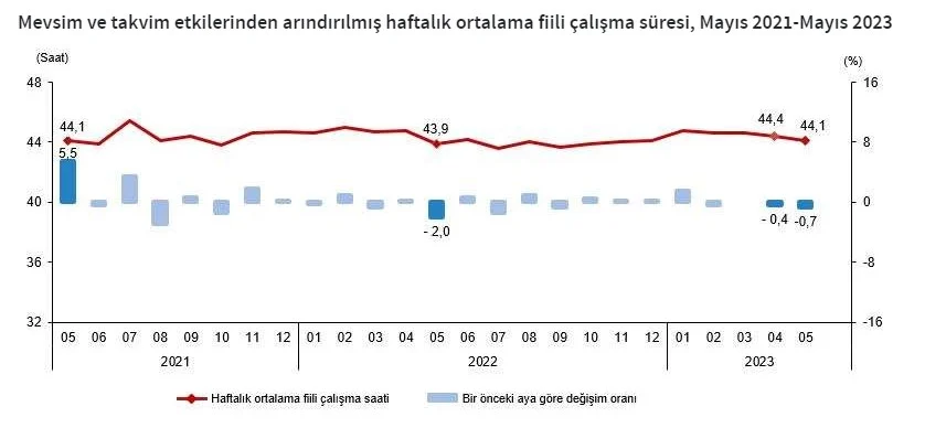 İstihdam edilenlerden referans döneminde işbaşında olanların, mevsim ve takvim etkilerinden arındırılmış haftalık ortalama fiili çalışma süresi 2023 yılı Mayıs ayında bir önceki aya göre 0,3 saat azalarak 44,1 saat olarak gerçekleşti.
