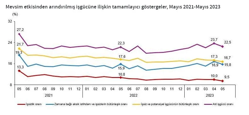 Zamana bağlı eksik istihdam, potansiyel işgücü ve işsizlerden oluşan atıl işgücü oranı 2023 yılı Mayıs ayında bir önceki aya göre 1,2 puanlık azalış ile %22,5 oldu. Zamana bağlı eksik istihdam ve işsizlerin bütünleşik oranı %15,8 iken işsiz ve potansiyel işgücünün bütünleşik oranı %16,7 olarak tahmin edildi.