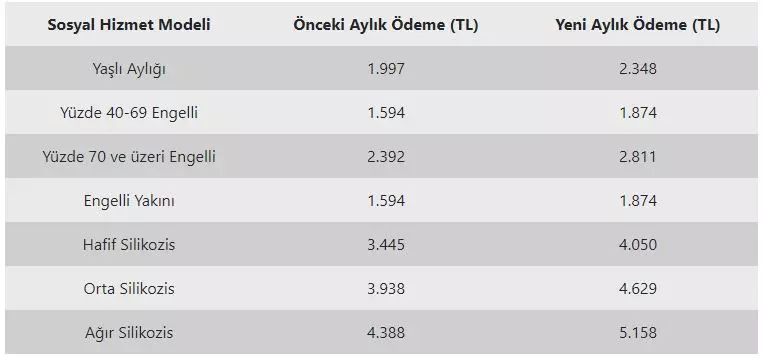 "Temmuz ayı memur maaş katsayısında yapılan yeni düzenleme sonrasında sosyal hizmet modelleri kapsamındaki yaşlı aylığı 1.997 TL’den 2.348 TL'ye, yüzde 40-69 arası engelli oranına sahip vatandaşların aylığı 1.594 TL’den 1.874 TL'ye, yüzde 70 ve üzeri engelli raporu bulunan vatandaşların aylığı da 2.392 TL’den 2.811 TL'ye yükseldi. Diğer yandan 18 yaş altı engelli yakını olan vatandaşlara ödenen engelli yakını aylığı 1.594 TL’den 1.874 TL'ye, hafif silikozis aylığı 3.445 TL’den 4.050 TL’ye, orta silikozis aylığı 3.938TL’den 4.629 TL’ye, ağır silikozis aylığı ise 4.388 TL’den 5.158 TL’ye çıktı. Yapılan yeni düzenleme sonrasında sosyal yardım programlarımızın aylık ödemelerini artışlı bir şekilde hak sahiplerimizin hesaplarına yatıracağız. Ödemelerin tüm vatandaşlarımıza hayırlı olmasını dilerim."