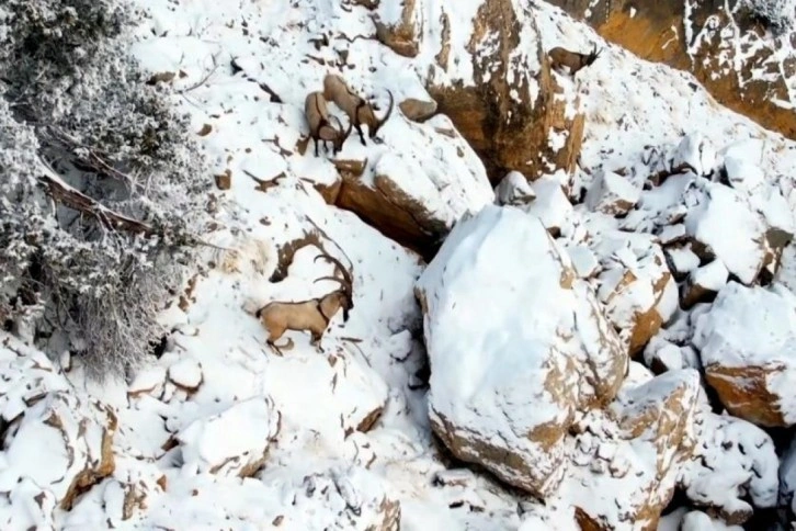 Dünya Doğa Koruma Birliğinin (IUCN) yayımladığı Nesli Tükenme Tehlikesi Altında Olan Türlerin Kırmızı Listesi'nde bulunan dağ keçileri, Erzincan'ın dağlarına renk katıyor. Yüksek kesimlere yağan karla birlikte zirve noktaları beyaza bürünen dağlarda gezinen dağ keçileri, Mert Yılmaz ve arkadaşı Umut Yıldız tarafından havadan kayıt altına alındı. Karlı arazide zaman zaman erkek dağ keçilerinin liderlik için birbirlerine güç gösterisinde bulundukları gözlenirken diğer dağ keçilerinin de sürü liderini takip ettikleri dron kameraya yansıdı