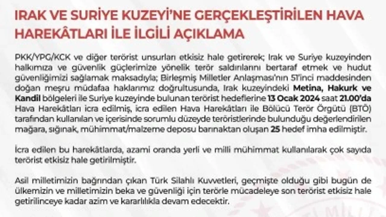 Milli Savunma Bakanlığı, Irak’ın ve Suriye’nin kuzeyindeki terörist hedeflere yönelik düzenlenen hava harekatında 25 hedefin imha edildiğini, çok sayıda teröristin etkisiz hale getirildiğini açıkladı.Milli Savunma Bakanlığının, “Nerede bir terör tehdidi, kampı, sığınağı, oluşumu veya kümelenmesi varsa kalıcı olarak imha edilecek” ifadeleri ile yaptığı açıklamaya göre, PKK/YPG/KCK ve diğer terörist unsurlara karşı, Irak ve Suriye’nin kuzeyinden güvenlik güçlerine yapılan terör saldırılarını bertaraf etmek amacıyla saat 21.00’de Irak’ın kuzeyindeki Metina, Hakurk ve Kandil bölgeleri ile Suriye’nin kuzeyinde bulunan terörist hedeflerine hava harekatı gerçekleştirildi.Düzenlenen harekat sonucu bölücü terör örgütü tarafından kullanılan ve içerisinde sorumlu düzeyde teröristlerin bulunduğu değerlendirilen mağara, sığınak, mühimmat/malzeme deposu ve barınaktan oluşan 25 hedef imha edildi. Açıklamada, "İcra edilen bu harekatlarda, azami oranda yerli ve milli mühimmat kullanılarak çok sayıda terörist etkisiz hale getirilmiştir. Asil milletimizin bağrından çıkan Türk Silahlı Kuvvetleri, geçmişte olduğu gibi bugün de ülkemizin ve milletimizin beka ve güvenliği için terörle mücadeleye son terörist etkisiz hale getirilinceye kadar azim ve kararlılıkla devam edecektir. Bu harekatlar sırasında, masum insanların, dost unsurların, tarihi ve kültürel varlıklar ile çevrenin zarar görmemesi için her türlü tedbir alınmıştır” ifadelerine yer verildi.