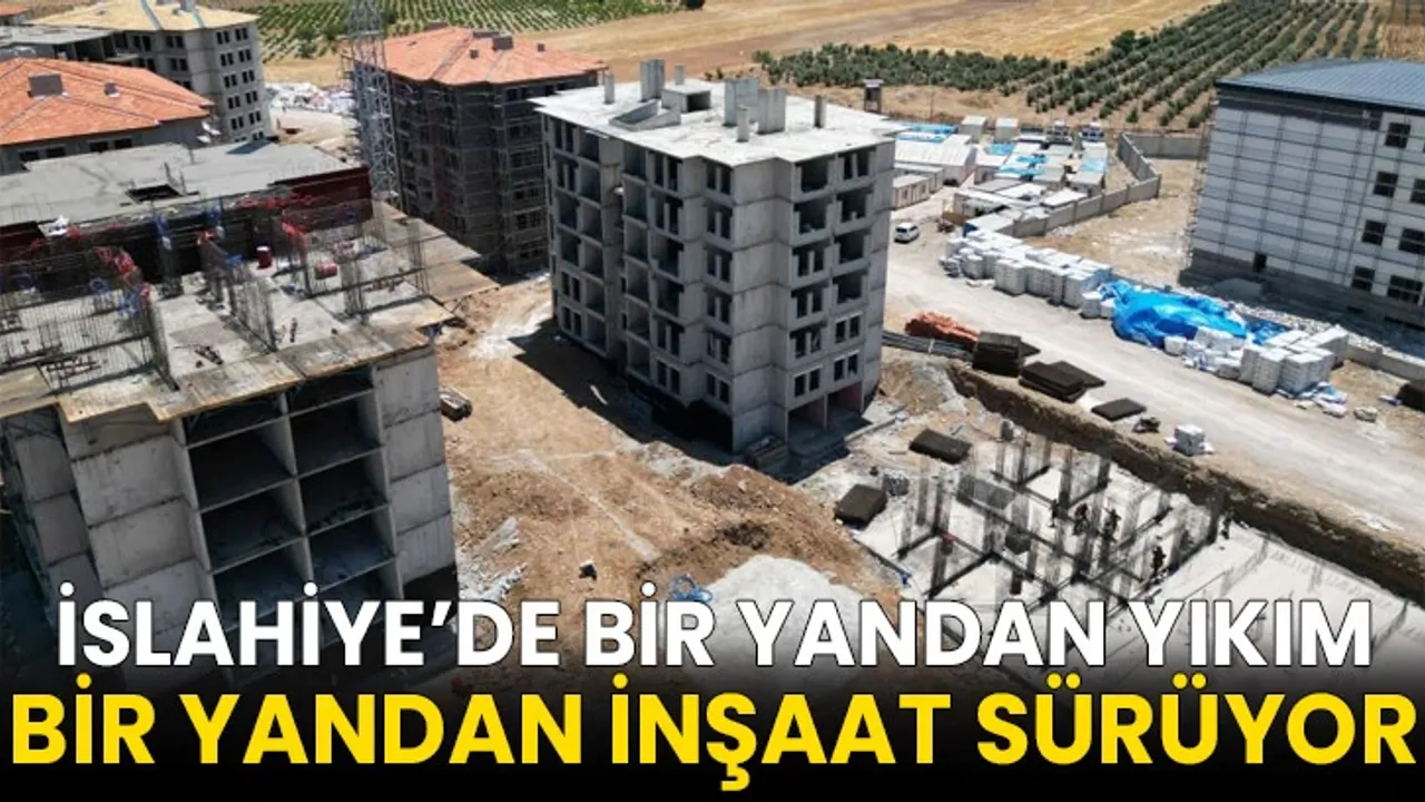 Gaziantep'in İslahiye ilçesinde bir yandan ağır hasarlı binaların yıkımı sürerken, diğer yandan da TOKİ'nin yaptığı konutların inşaatı sürüyor.