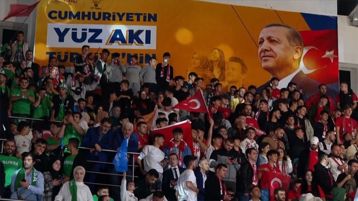 Arka planda led ekranların yerleştirildiği sahne hazırlanırken, Gazi Mustafa Kemal Atatürk ile Cumhurbaşkanı Erdoğan'ın fotoğrafları ve Türk bayraklarının yer aldığı salon içerisinde, AK Parti ve Türkiye Yüzyılı logoları öne çıkıyor.
