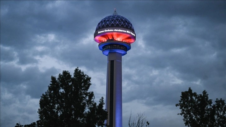 Vatandaşların huzur ve güvenliği için gece gündüz büyük özveriyle görev yapan Jandarma Teşkilatının kuruluşunun 184. yılına özel, kırmızı ve mavi renklerle ışıklandırılan Atakule'nin tepe kısmındaki ekrana "Kanun ordusu Jandarma 184 yaşında" ifadesi yansıtıldı.