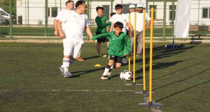 Babaların, oğullarına rakip olduğu gösteri maçı, renkli anlara sahne oldu.
