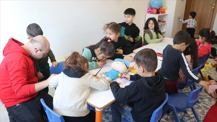 Görevli öğretmenler ve psikososyal destek uzmanlarınca çeşitli etkinlikler yapan çocuklar, hem eğitim alıyor hem de depremin yarattığı travmayı atlatmaya çalışıyor.