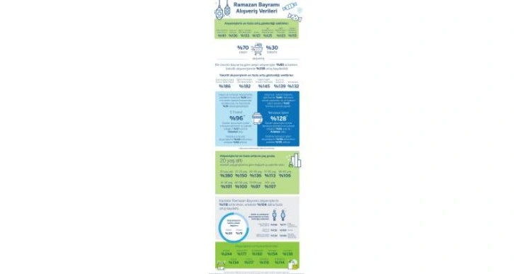 Son birkaç yıldır hızla büyüyen e-ticaret sektöründeki harcamalara bakıldığında, bu yıl Ramazan Bayramında 2022 yılına oranla yüzde 96'lık bir artış gözlemlendi. E-ticaretin toplam harcamalar içindeki payı Türkiye genelinde yüzde 26 düzeyinde olurken, şehirler bazında en yüksek oran yüzde 37 ile İstanbul'da gerçekleşti. Diğer taraftan kadınlar e-ticaret harcamalarını yüzde 103, erkekler yüzde 92 arttırdı.