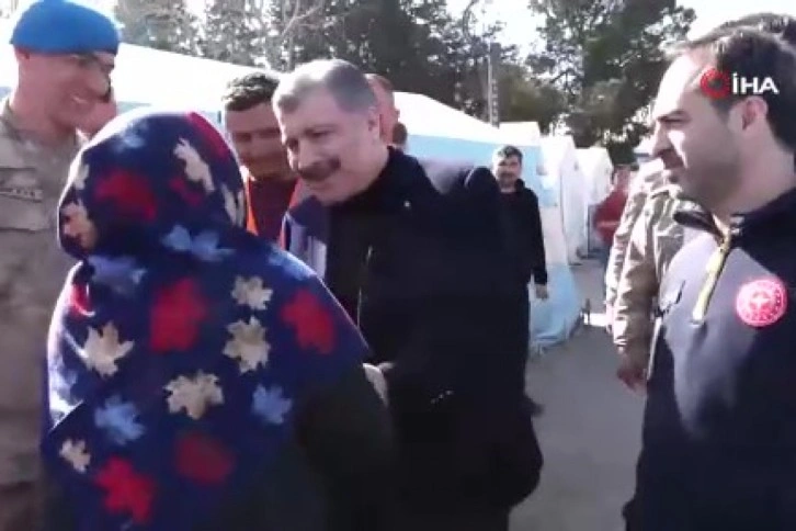 Sağlık Bakanı Fahrettin Koca, Kahramanmaraş'ta çadır ve konteyner kentlerde yaşayan afetzede vatandaşlarımızı ziyaret etti. Ziyaret sırasında yanına gelen bir depremzede kadın hem dua etti, hem de Bakan Koca'yı yakından gördüğü için duyduğu memnuniyeti dile getirerek teşekkür etti. Yaşlı kadın, Bakan Koca'ya depremde yakınlarını kaybettiğini söyleyerek acısını paylaştı. Koca'da teselli ederek bol bol dua etmesini isteyerek “Bu afeti hep bir birlikte aşacağız” dedi.