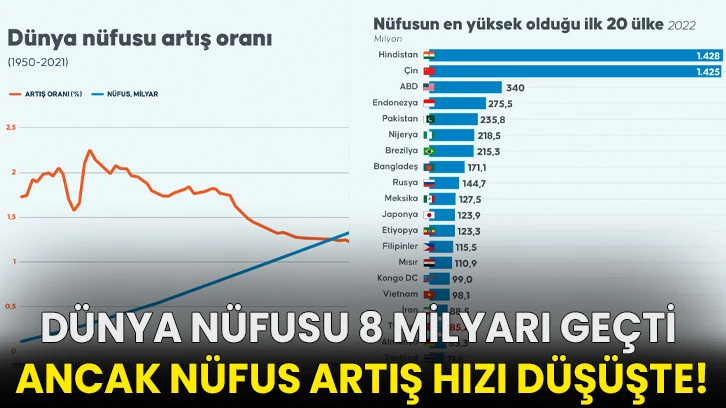 Dünya genelinde nüfus artış hızı azalırken dünya nüfusu 8 milyarı geçti. Dünyanın 2100'de 10 milyardan fazla insana ev sahipliği yapması bekleniyor.