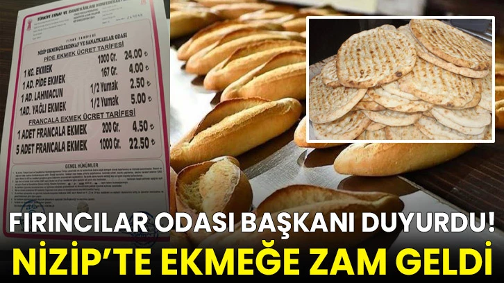 Nizip Fırıncılar Odası Başkanı Yılmaz'ın yaptığı açıklamaya göre, Nizip'te Pide ekmek, Francala ve lahmucun pişirim ücretlerine zam geldi. Gelen yeni zamlar ile birlikte 3 liradan satılan pide ekmek 4 lira, 3,5 liradan satılan francala(Somun Ekmek) 4.5 lira, 2 lira olan lahmacun pişirme ücreti 2,5 lira oldu.