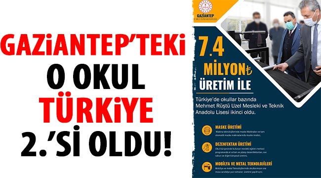 Gaziantep İl Milli Eğitim Müdürü Yasin Tepe, 2020 yılında okullar bazında yapılan sıralamada, Mehmet Rüştü Uzel MTAL’nin, 7,4 milyon liralık üretimle Türkiye genelinde 2. olduğunu söyledi.