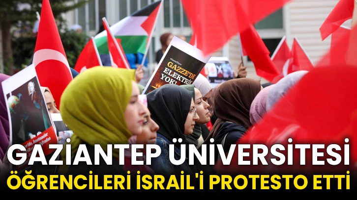 Gaziantep Üniversitesi (GAÜN) Merkezi Öğrenci İşleri Daire Başkanlığı önünde toplanan öğrenciler, ellerinde Türkiye ve Filistin bayraklarıyla slogan atıp İsrail'e tepki gösterdi.