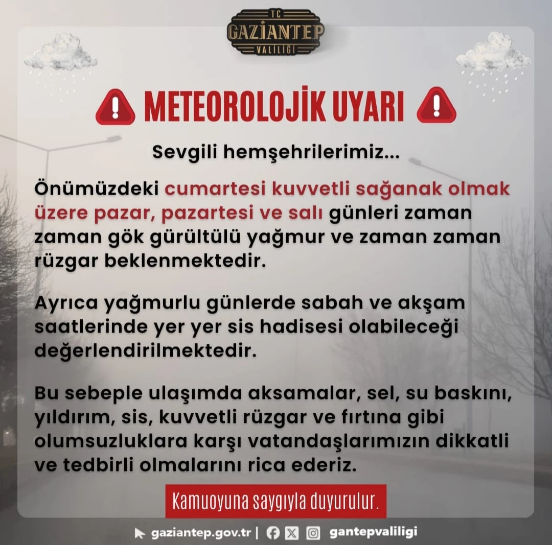 Gaziantep Valiliği, sosyal medya hesapları üzerinden yaptığı bir paylaşımla vatandaşları önümüzdeki dört gün boyunca beklenen olumsuz hava koşullarına karşı uyardı.