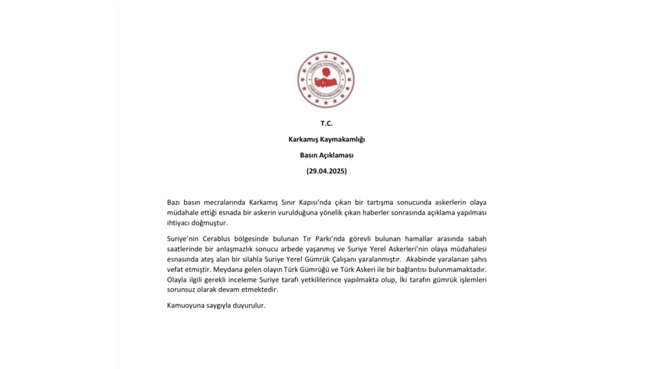Gaziantep’in Karkamış ilçesi karşısında, 29 Nisan 2025 sabah saatlerinde  Suriye’nin Cerablus bölgesinde yer alan Tır Parkı’nda görevli hamallar arasında  yaşanan anlaşmazlık, kısa sürede arbedeye dönüştü. Olay sırasında Suriye Yerel Askerleri’nin müdahale ettiği sırada ateş alan bir silahın sonucu olarak bir Suriye Yerel Gümrük Çalışanı yaralandı. Yaralanan şahsın yapılan müdahalelere rağmen hayatını kaybettiği bildirildi.