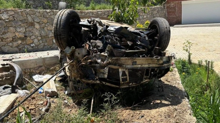 Savrulan otomobil, yaklaşık 10 metre yükseklikteki istinat duvarını aşıp bir evin bahçesine uçtu.