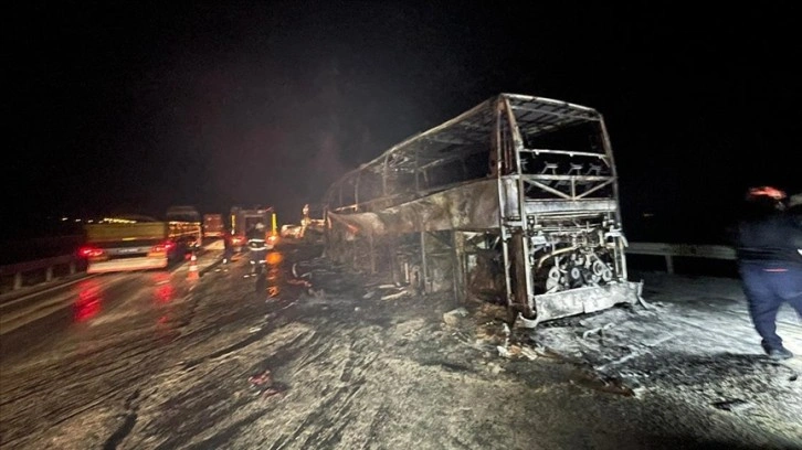 Kazanın ardından alev alan otobüste yangın çıktı.