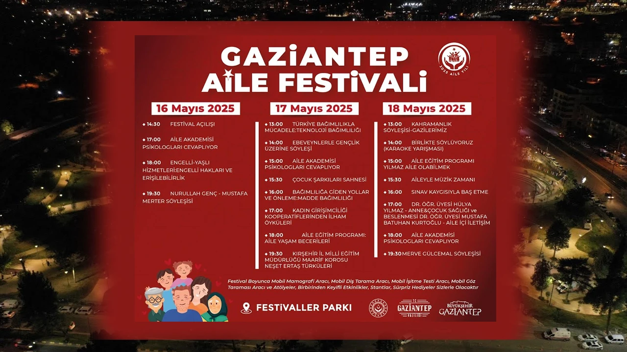 Cumhurbaşkanı Recep Tayyip Erdoğan'ın 2025 yılını "Aile Yılı" olarak ilan etmesiyle aile yapısını sergilemek amacıyla büyüme hızı veren Gaziantep Büyükşehir Belediyesi, festival hazırlıklarını tamamladı. Aile ve Sosyal Hizmetler Bakanı Mahinur Özdemir Göktaş ve Başkan Fatma Şahin'in açılışıyla başlayacak festivalde yeni aile uygulaması tanıtılacak.