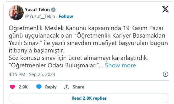 Milli Eğitim Bakanı Yusuf Tekin, sosyal medya hesabından yaptığı paylaşımda, Öğretmenlik Kariyer Basamakları Yazılı Sınavı'na ilişkin şu açıklamayı yaptı: