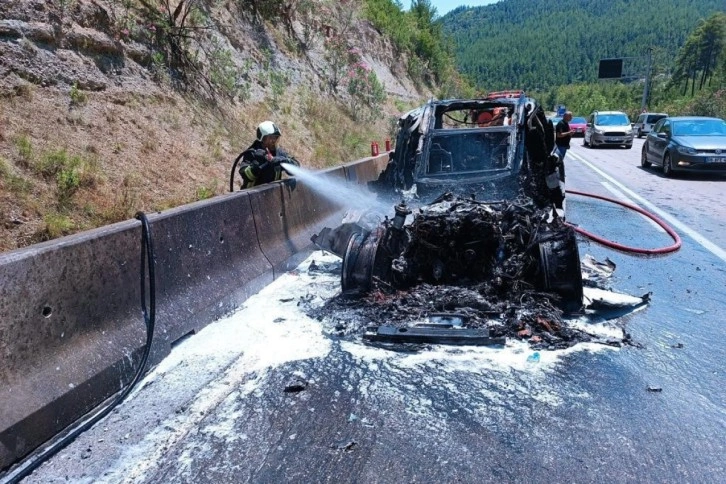 Seyir halinde alev alan lüks cip yanarak kullanılamaz hale geldi