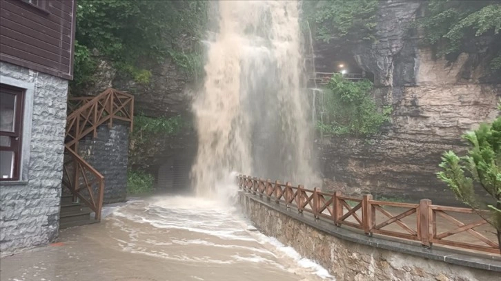 Akış hızı artan şelalenin suları, mağaraya ulaşımın sağlandığı yola taştı.