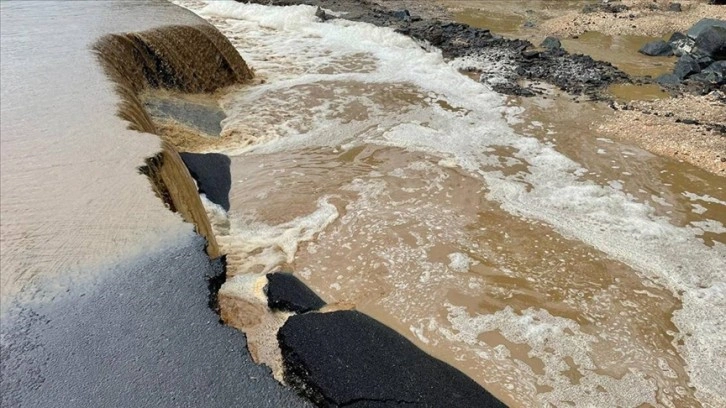 Asfaltın bazı bölümlerine zarar veren taşkın nedeniyle yol trafiğe kapatıldı. Taşkın, arazilere yayılmaya devam ediyor.