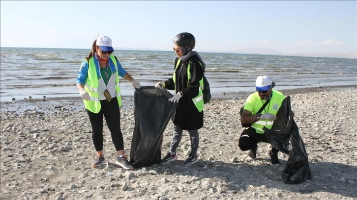 Etkinlik kapsamında Lalapaşa sahilinde buluşan, aralarında çocuklar ve bisiklet tutkunlarının da bulunduğu çok sayıda kişi, Van Gölü çevresinde temizlik yaptı.