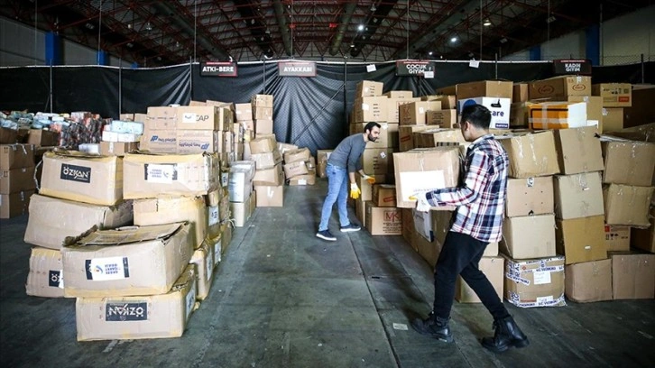 Kayıt yapılarak teslim alınan çadır, elektrikli ısıtıcı, uyku tulumu, kıyafet, ayakkabı, gıda, ilaç, temizlik ve tıbbi malzemeler, özenle tasniflenerek kategorilere ayrılıyor.
