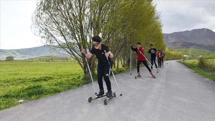 İlçede 8-10 Mart'ta düzenlenecek Tekerlekli Kayak Şampiyonası'na da iddialı hazırlanan 60 sporcu, madalya hedeflerine ulaşmak için kara yolu ve köy yollarında antrenmanlarını sürdürüyor.