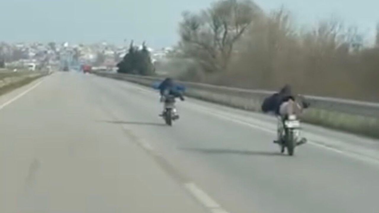 Karacabey-Bandırma karayolunda seyir halinde olan bir vatandaş tarafından cep telefonu ile kaydedilen görüntülerde, iki motosiklet sürücüsünün motosiklet üzerine yüzüstü uzanarak ilerlediği görüldü. Görüntüyü kaydeden aracın hız göstergesinde ise hızın yaklaşık 115 kilometre olduğu dikkat çekti.
