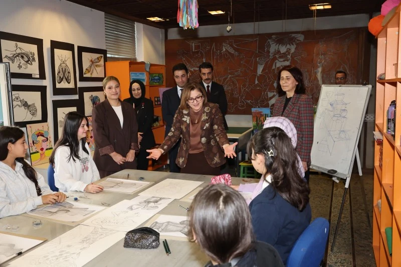 Atölyelerin devam ettiği Kahraman Emmioğlu Kültür ve Sanat Merkezi’nde kursiyerlerle bir araya gelen Başkan Fatma Şahin, piyano, keman ve resim eğitimi alan çocukların çalışmalarını yakından inceleyerek performanslarını izledi.