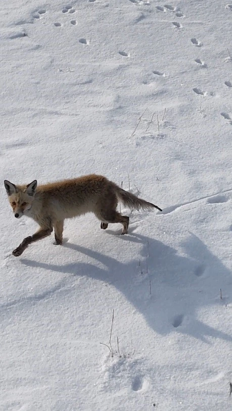 Kars'ta karla kaplı arazide karnını doyurmak için ava çıkan kızıl tilki, bu kez kendisini takip eden teknolojiye yakalandı.