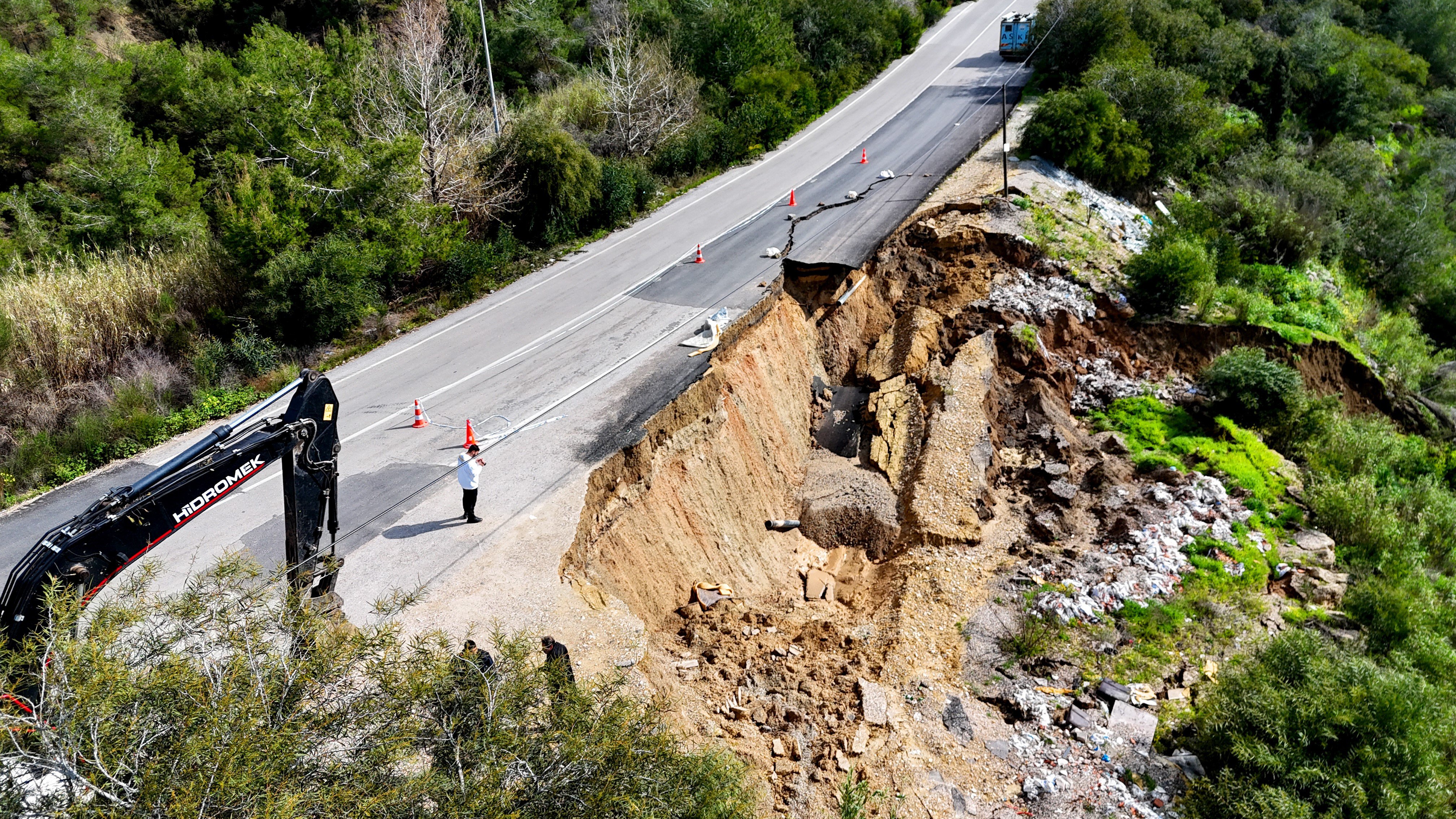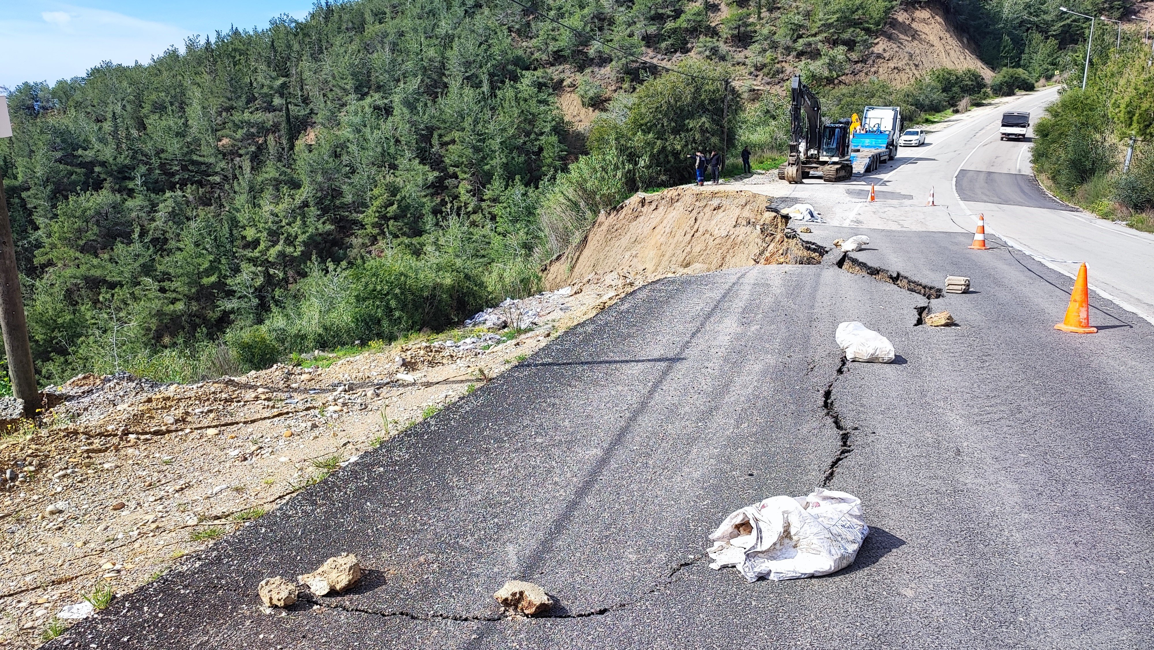 Yetkililer, yolun tamamen ulaşıma kapanmaması için çalışmaların sürdüğünü belirtirken, hasar gören içme suyu hattının da onarılması için ekiplerin çalışması sürüyor.
